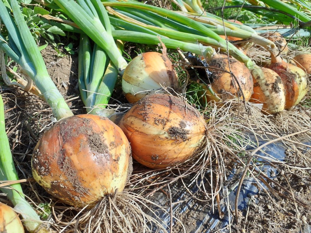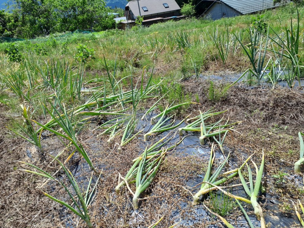 じゃが・たま・にんじんの内、人参はまだ間引きながらの収穫でじゃがいもはもう少し先ですが、たまねぎの地上部が倒れてきたので収穫を始めました。