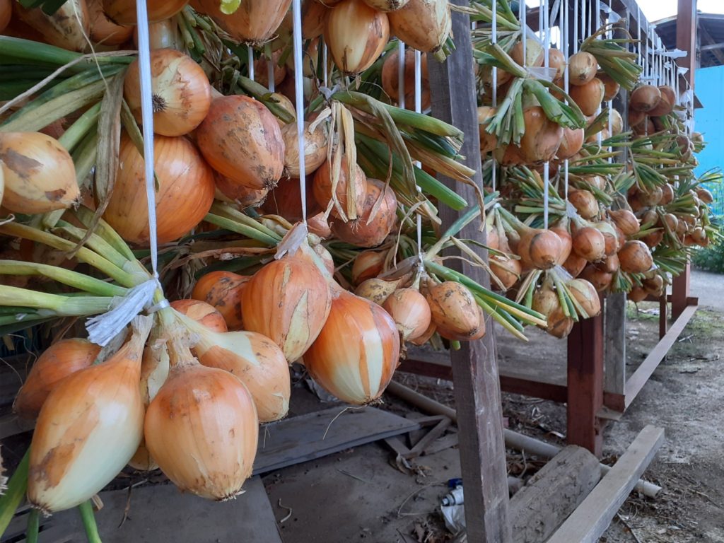 風通し良く吊るしました。キズなどで収穫の段階でのハジキで乾燥たまねぎを作ります。こちらは水分が飛んで